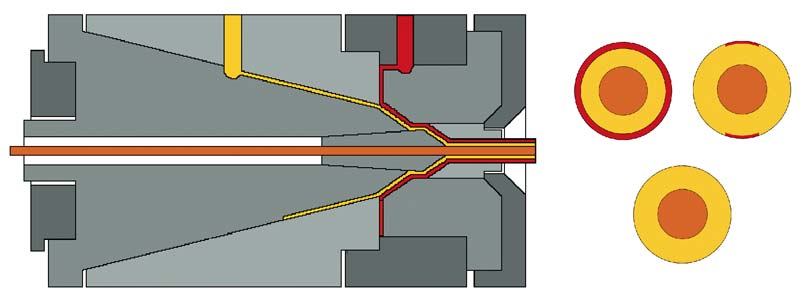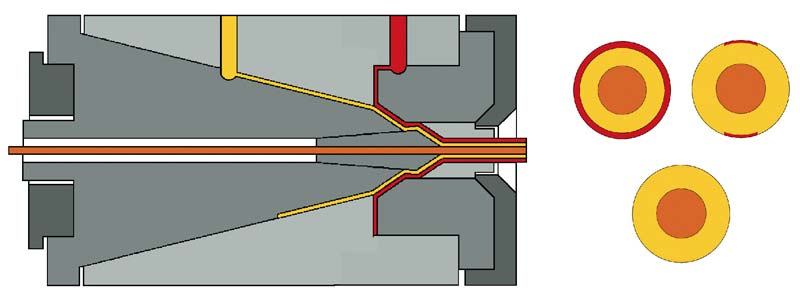 Co-extrusion insulation crossheads are designed for a main layer and an additional skin or stripe. By using different program inserts, one may select between skin extrusion, stripe extrusion or single layer extrusion. Crossheads are fed with 1 main extruder and a smaller secondary extruder for the skin/stripe layer.